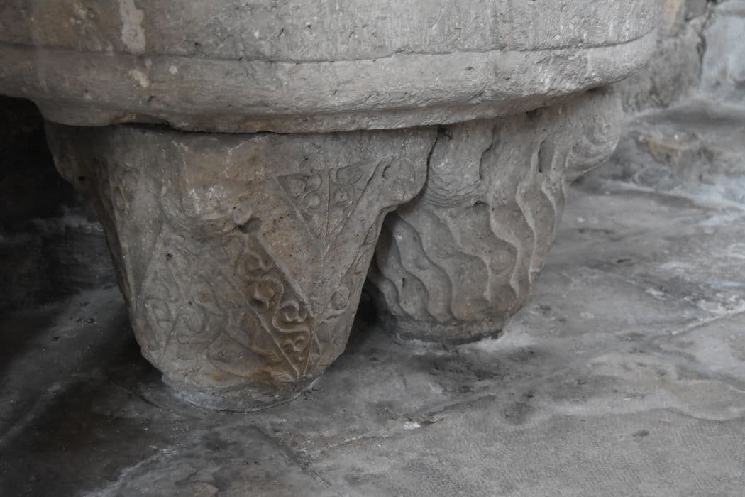 cuve baptismale, détail des chapiteaux supportant la cuve