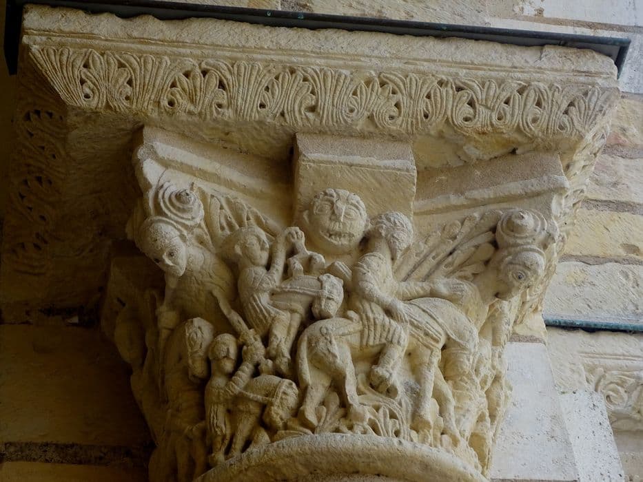 clocher-porche, détail d’un chapiteau sculpté