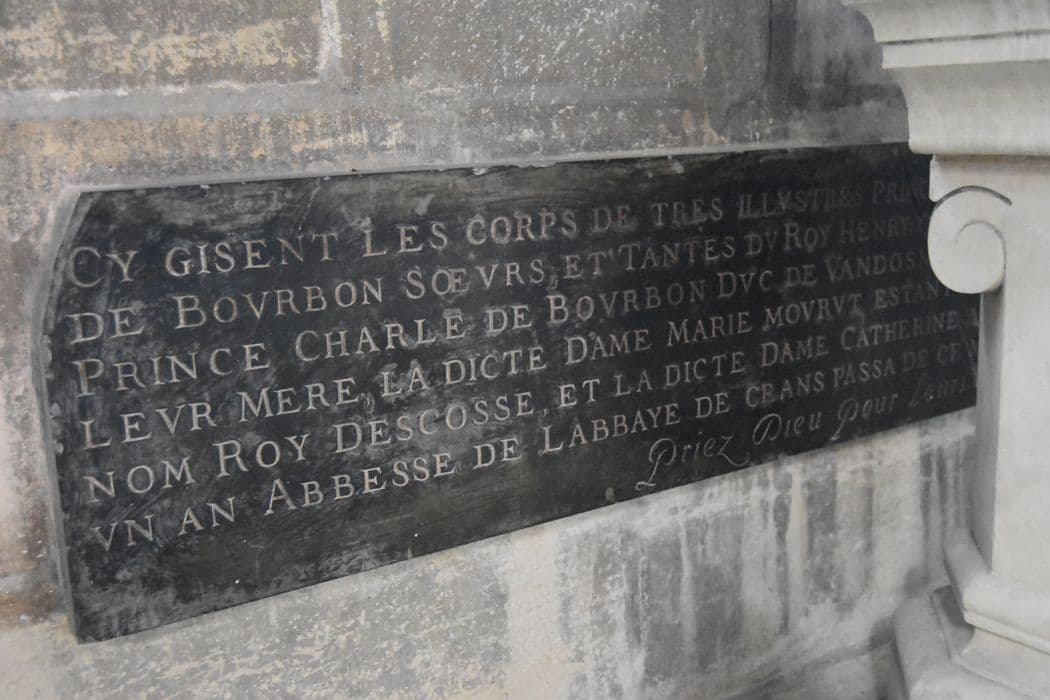 plaque commémorative du tombeau de Marie de Bourbon Vendôme et de sa sœur Catherine de Bourbon, abbesse de l'abbaye Notre-Dame de Soissons