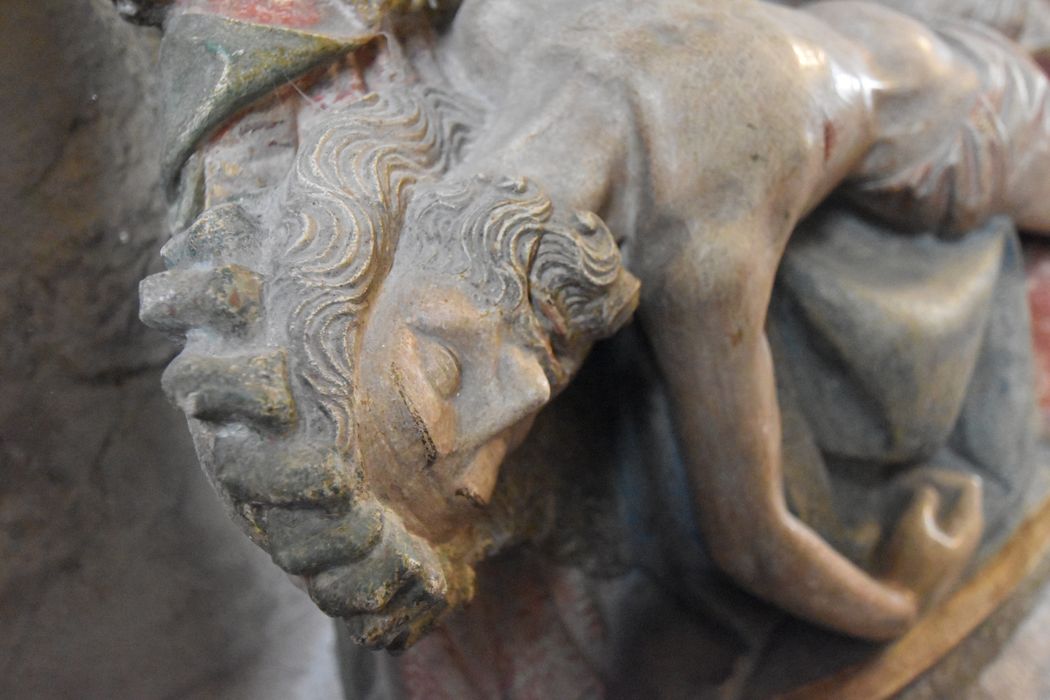 groupe sculpté (statuette) : Vierge de Pitié entre sainte Madeleine et un ange, détail