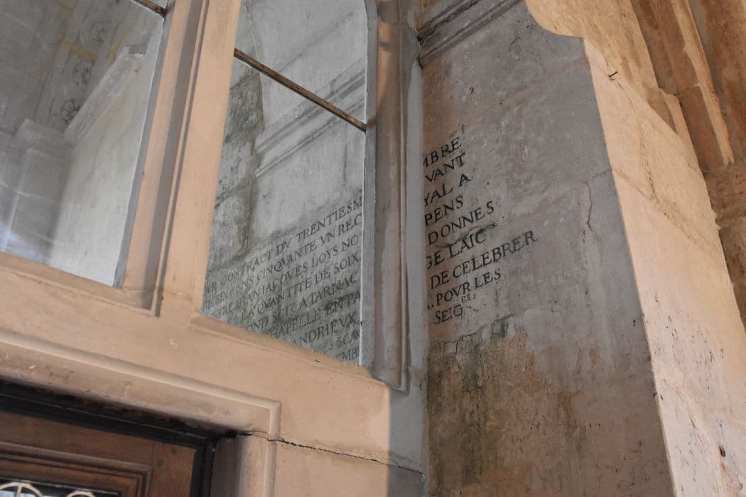 chapelle latérale nord, détail d’une inscription, vue partielle