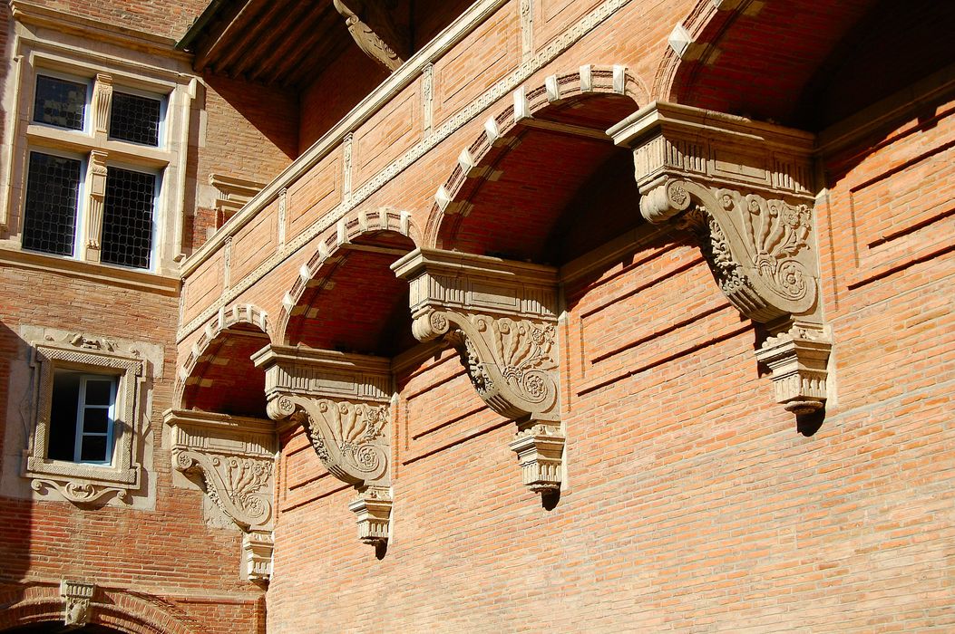 façade sur cour, détail des consoles supportant la galerie du 1er niveau