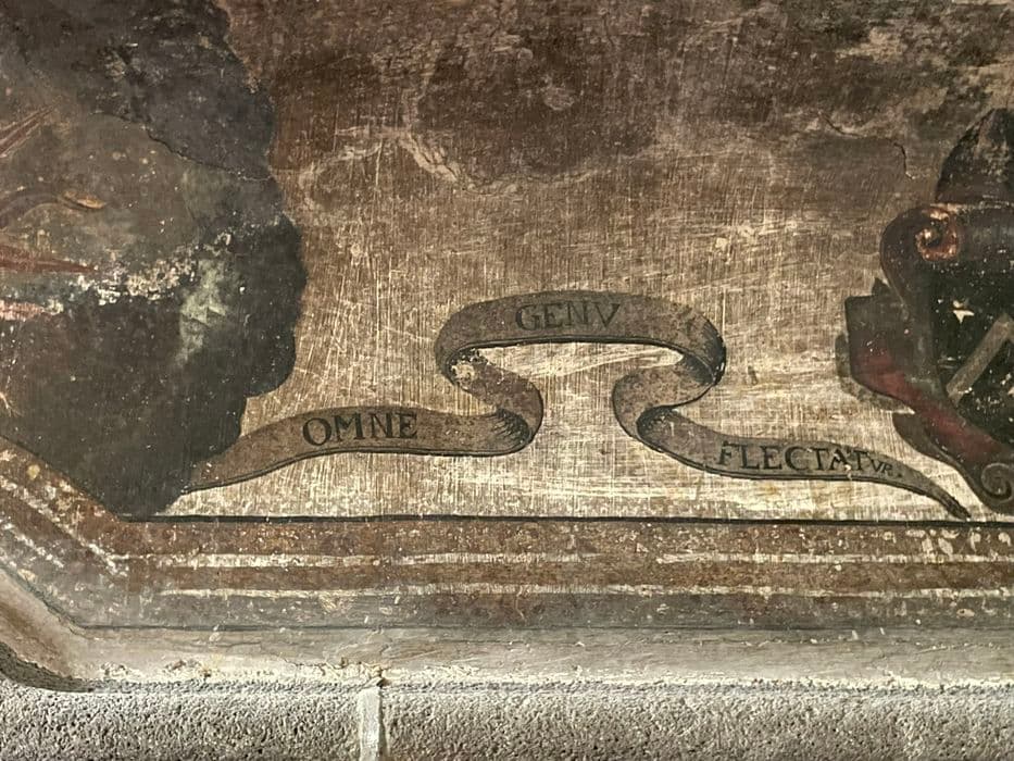 cheminée monumentale en partie peinte représentant deux blasons avec crosse et mitre d'Antoine Rigoulet, abbé de Mozac de 1613 à 1641, détail