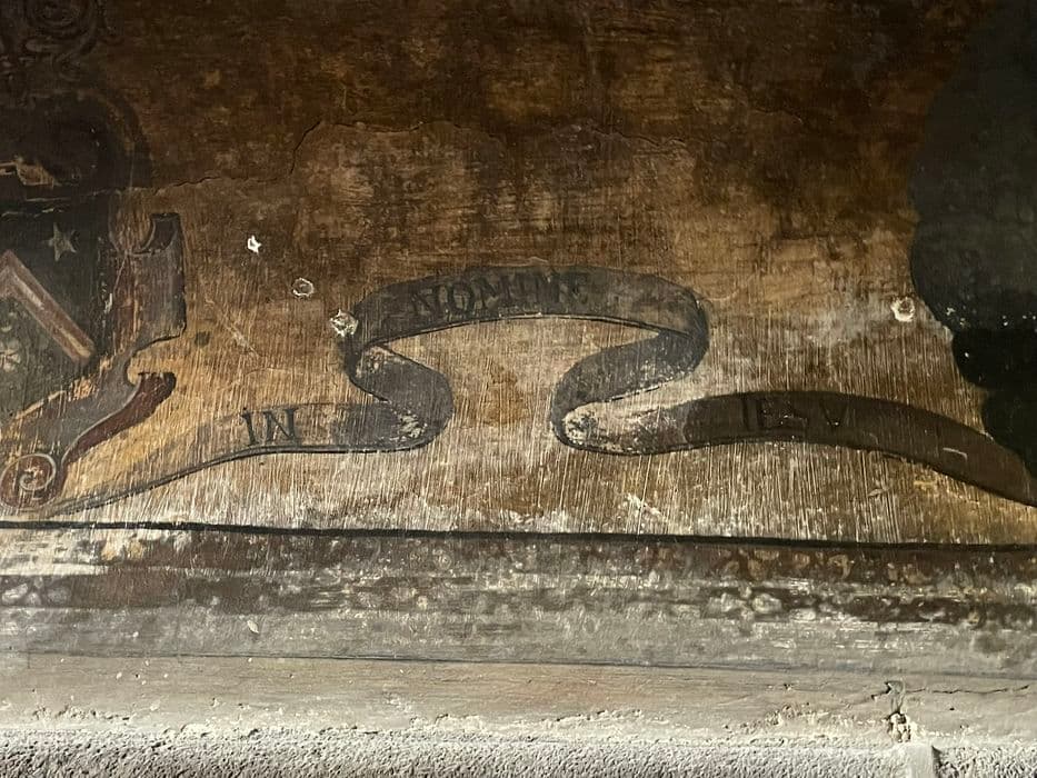 cheminée monumentale en partie peinte représentant deux blasons avec crosse et mitre d'Antoine Rigoulet, abbé de Mozac de 1613 à 1641, détail