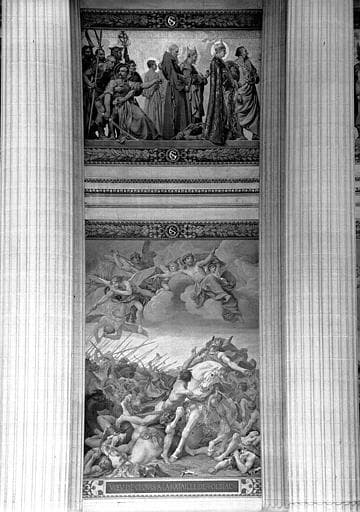 POP | Plateforme ouverte du patrimoinePeintures murales : Procession de saints et baptême de Clovis (haut, travée centrale), Bataille de Tolbiac (bas, travée centrale)