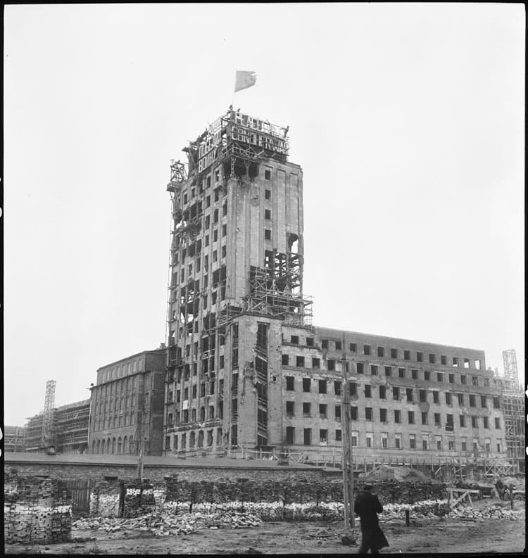 POP | Plateforme ouverte du patrimoineLa reconstruction de Varsovie (Pologne), 1950 ; [Immeuble en ruine orné d'un message de paix]