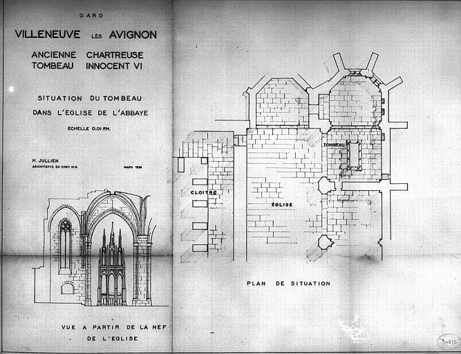 Tombeau d'Innocent VI : Plan de situation du dans l'église et vue à partir de la nef