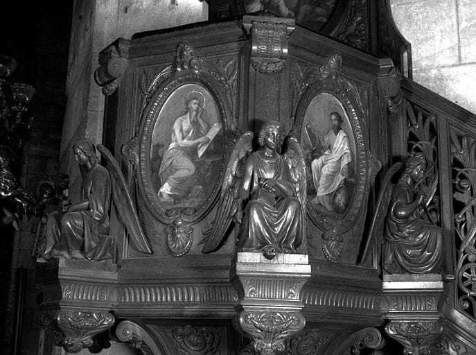 POP | Plateforme ouverte du patrimoineDétail de la chaire : Anges en ronde-bosse et médaillons peints représentant saint Jean et saint Luc