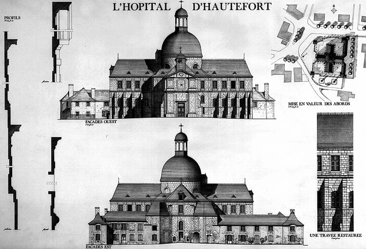 Mise en valeur des abords, élévations des façades est et ouest, profil d'une travée restaurée (plume et rehauts à la mine de plomb)