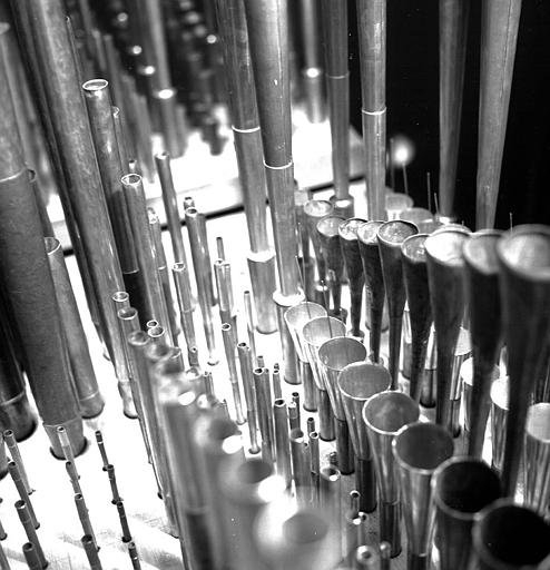 POP | Plateforme ouverte du patrimoineOrgue : Anches du grand orgue et récit (de droite à gauche : 1ère trompette grand orgue, hautbois de récit, 2ème trompette, grand orgue, trompette du récit)