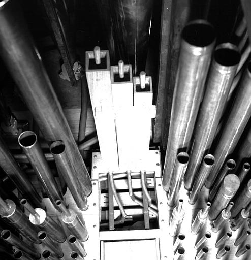 POP | Plateforme ouverte du patrimoineOrgue : Détail du grand orgue (du fond vers l'avant : Montre 16, montre 8, bourdon 8, flûte 4, prestant 4, au centre : 3 tuyaux de bourdon en bois postés, les postages bien visibles sont en plomb)