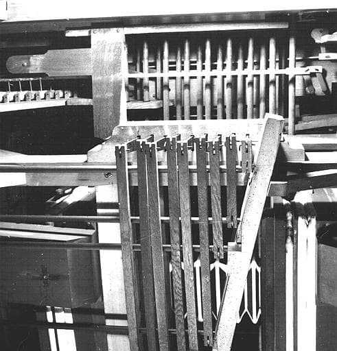 Orgue : Equerres en fer qui relient les tirants en bois de la console aux tirants en bois carrés