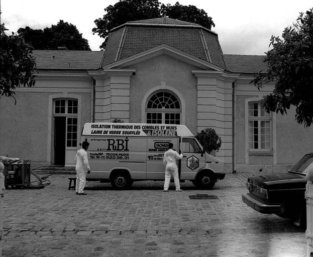 POP | Plateforme ouverte du patrimoineIsolation des combles de la laiterie : Camionette et ouvriers dans la cour