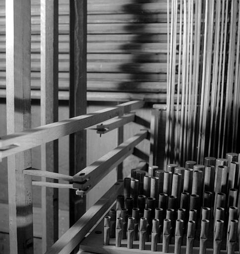 Orgue : Tirants de registres, tournants octogonaux et équerre en fer, rouleaux d'abrégé de pédale, vergette du grand orgue, détail du cornet d'écho