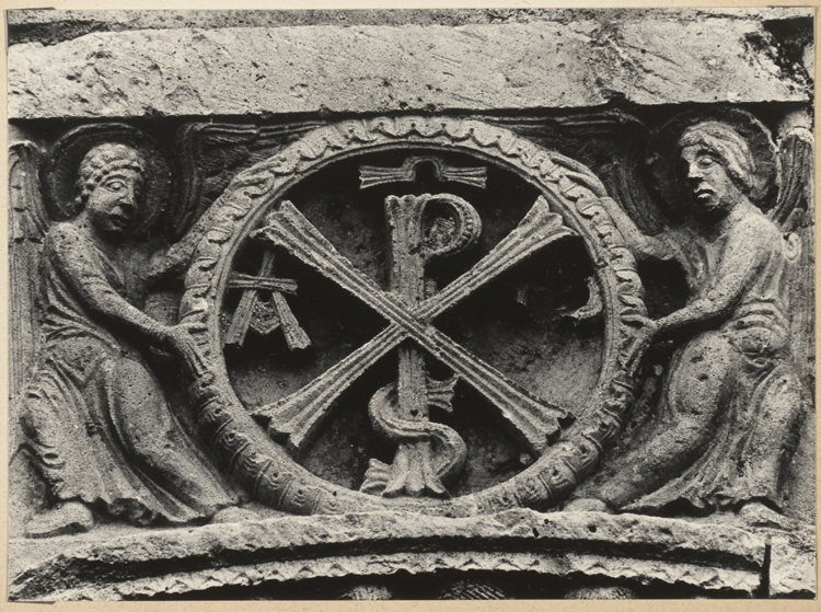 Élément sculpté : monogramme du Christ dans une couronne tenue par deux anges
