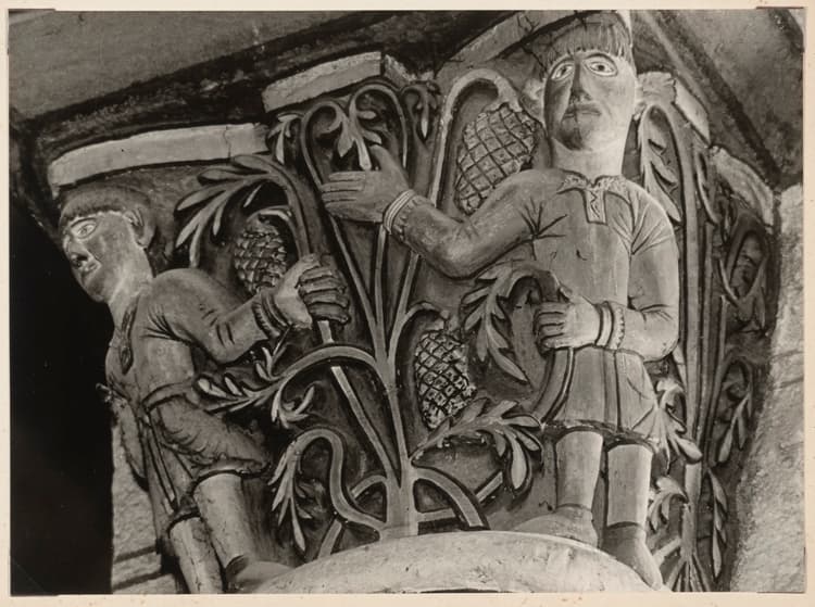 Chapiteau : personnages tenant des grappes de raisin