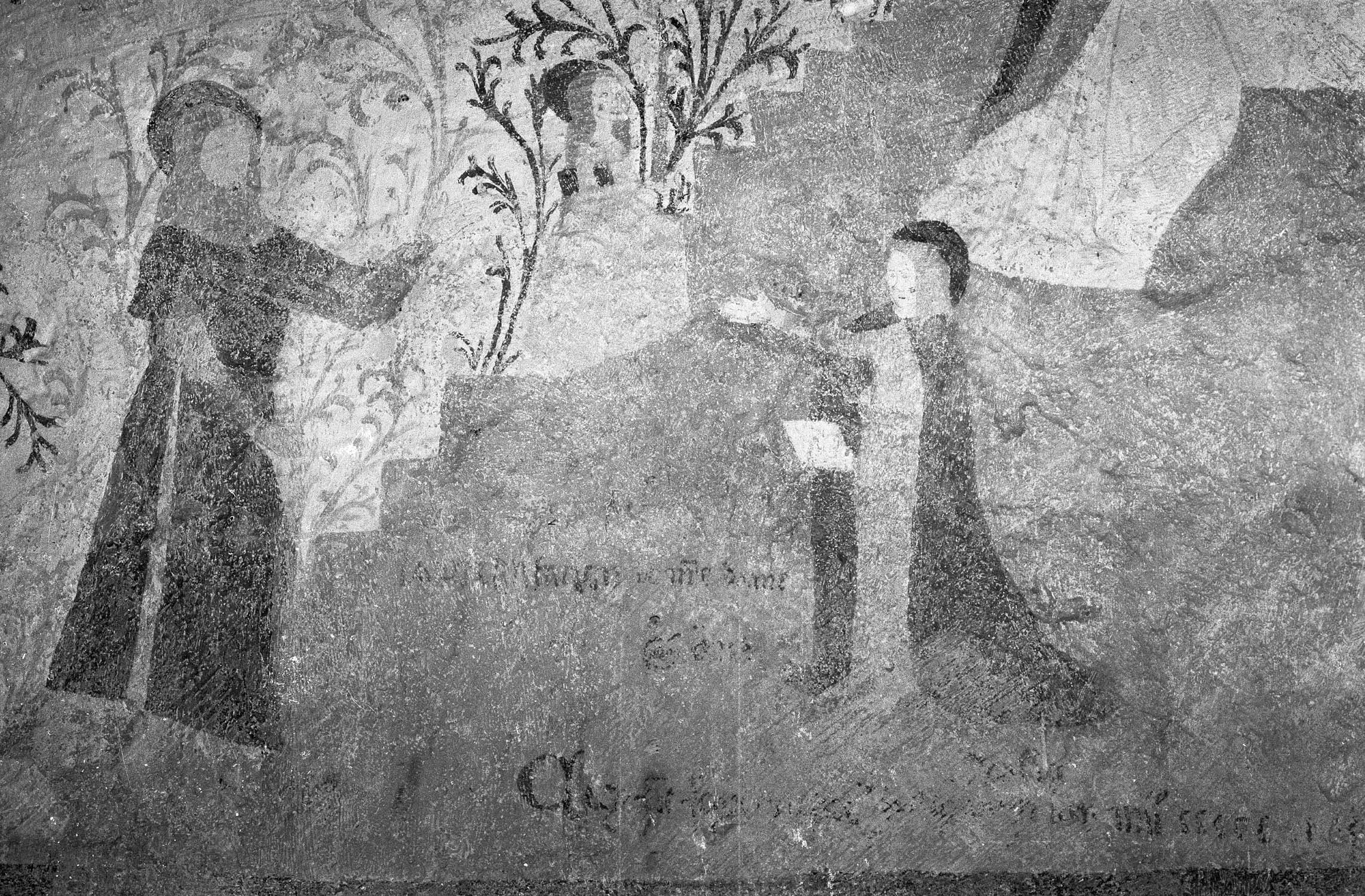 Peintures murales : détail de la scène avec personnages, en bas au centre