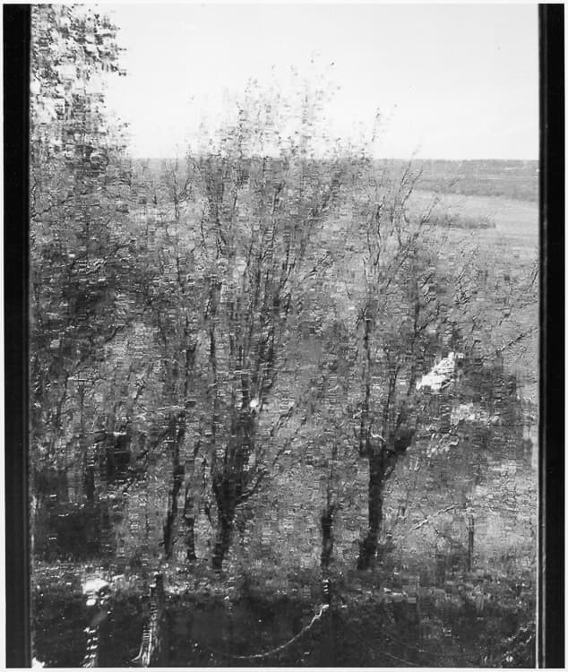 Reflet ; Campagne ; Paysage ; Arbre ; Premier plan repoussoir ; Flou filé ; Fenêtre ; Cadre dans le cadre