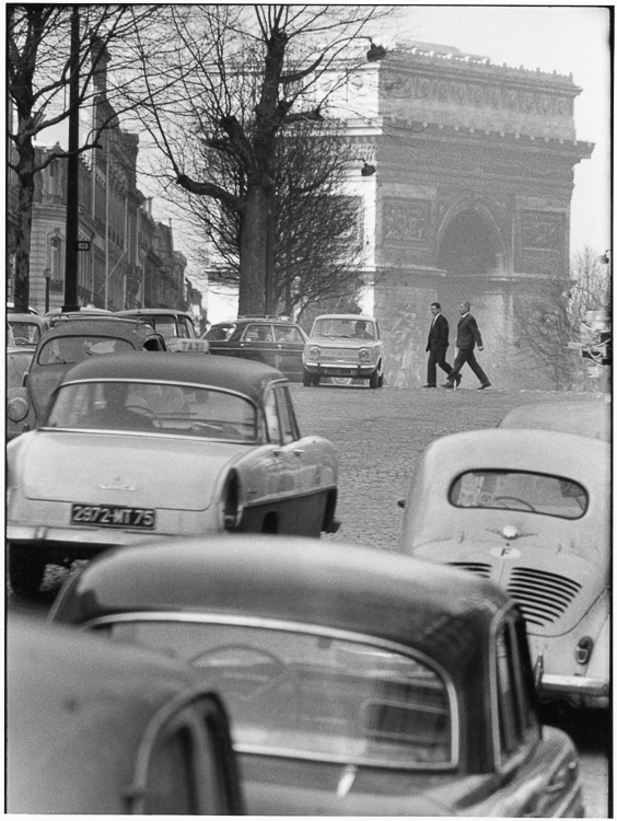 Cette photographie se situe dans une période où l'essentiel de mon revenu professionnel était lié à des travaux de photographie appliquée : industrie et publicité. J'étais néanmoins souvent en rapport avec des clients qui savaient utiliser mon savoir-faire : saisir l'impromptu, à partir de critères précis d'efficacité, dictés par les caractéristiques de la commande. L'agence Publicis m'avait donc chargé, pour le compte d'une grande marque d'essence, de réaliser, à Paris et dans une dizaine de grandes villes de France, des photographies où devaient chaque fois figurer deux hommes et une voiture Citroën ou Simca. La photographie devait donner les apparences du reportage, le lieu être immédiatement identifiable, et la composition obligatoirement en hauteur. Et chaque lieu devait fournir matière à plusieurs sujets utilisables (pour Paris ce fut l'Etoile, le Pont-Neuf, les Champs-Elysées). L'image ci-contre fut réalisée avenue d'Iéna, en février 1963, debout sur un banc, au téléobjectif de 200 mm. Cette photographie, à ma connaissance, n'a pas été publiée. C'est néanmoins, pour le thème Paris, celle que je préfère. Tirage de difficulté moyenne. Cadrage intégral.