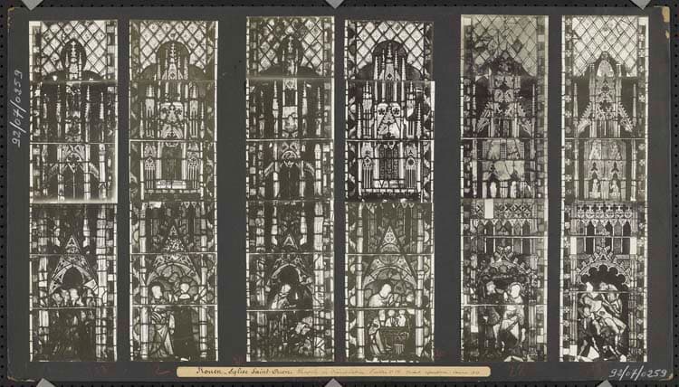 Tirages sur papier au gélatino-bromure d’argent, contrecollés sur un carton recouvert de papier noir ; Reconstitution des vitraux par assemblage de prises de vues ; Photomontage restauré en 2021