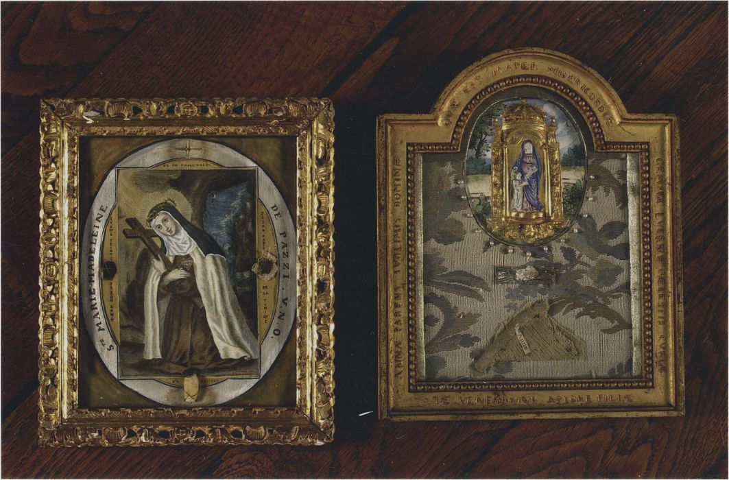 2 tableaux-reliquaires, cadres : Sainte Marie-Madeleine de Pazzi ; Sainte Anne et la Vierge