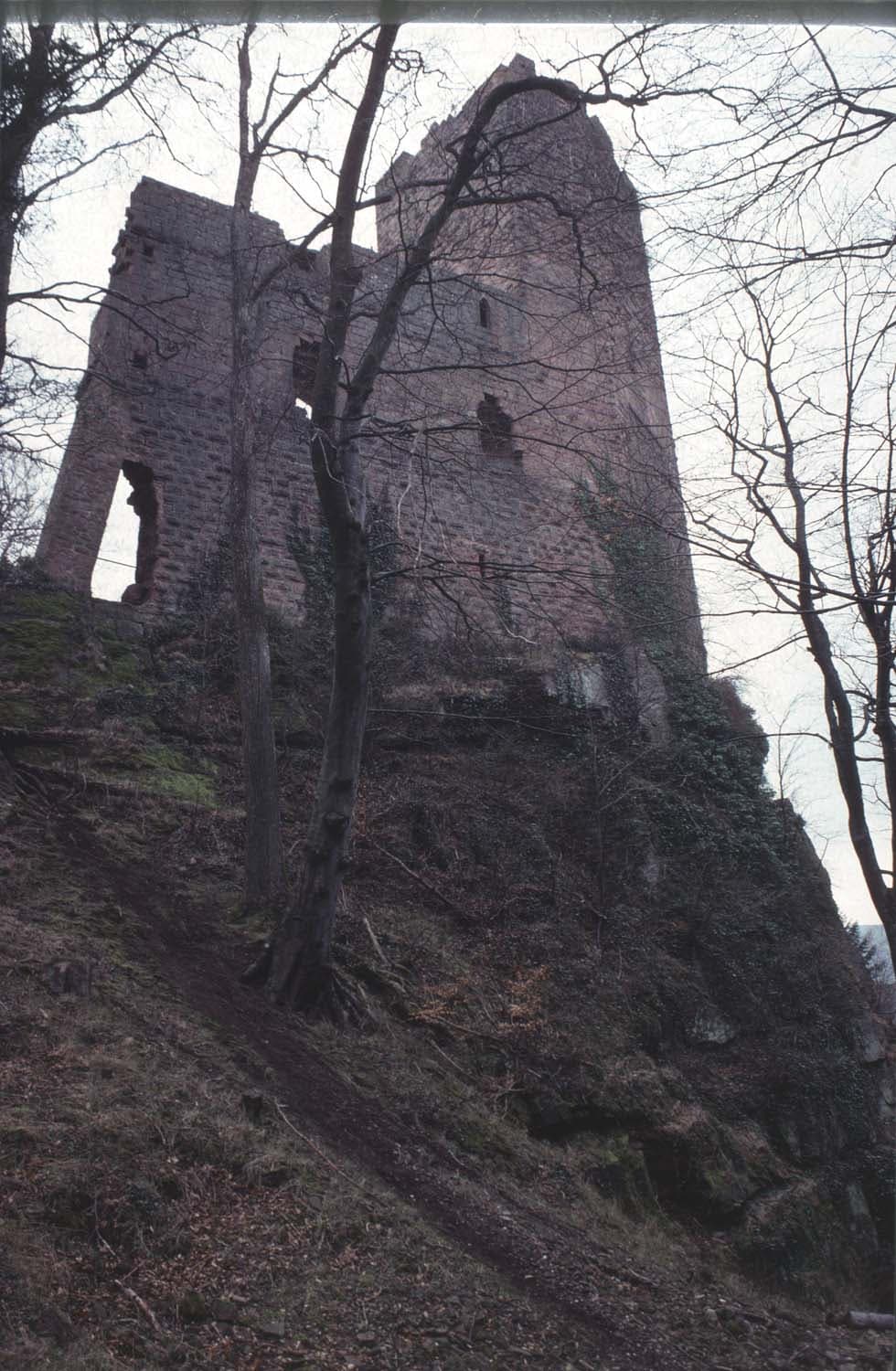 Vestiges du donjon, vue nord à distance prise en contrebas