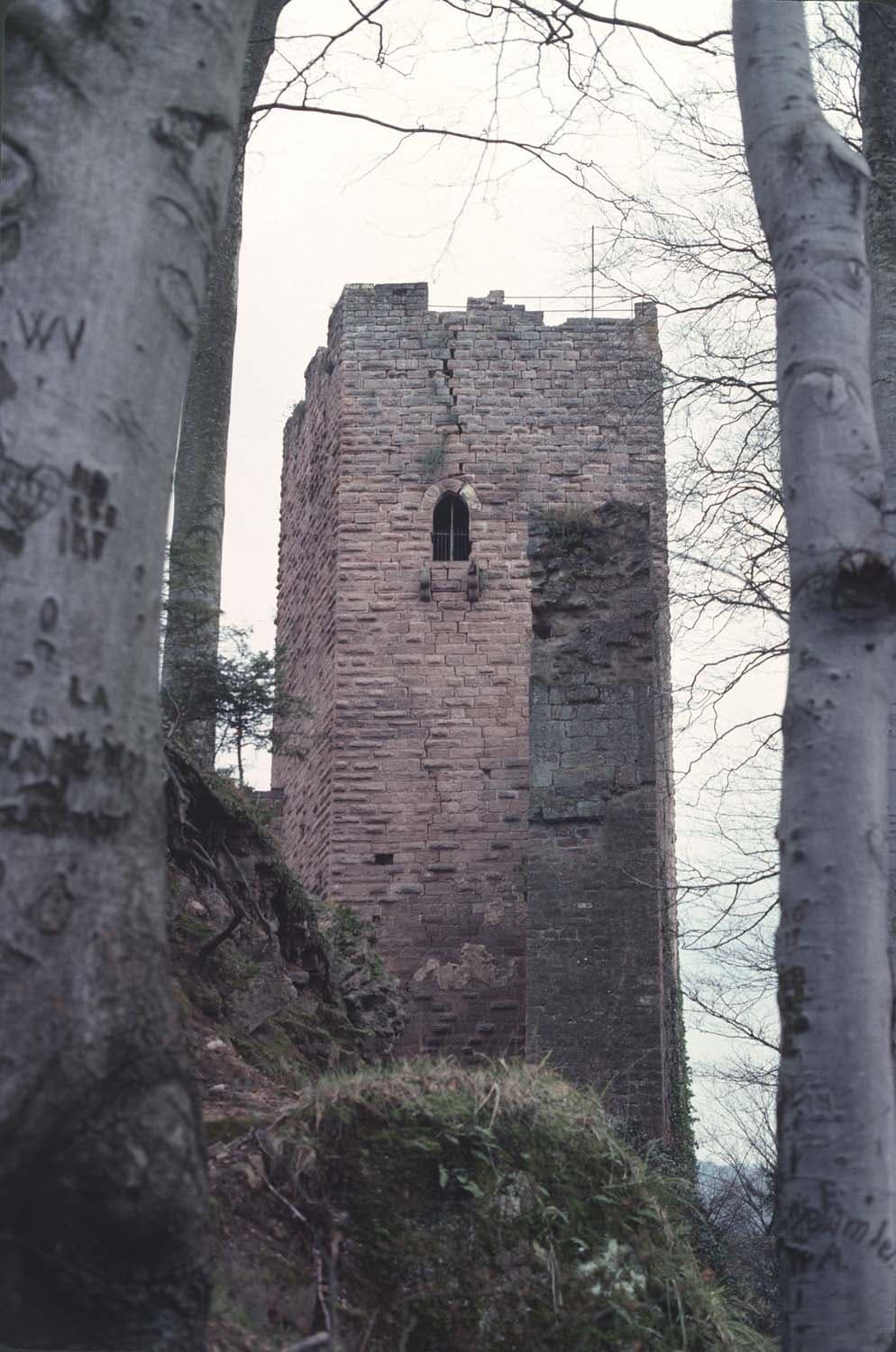Donjon : face est, vue générale entre les arbres