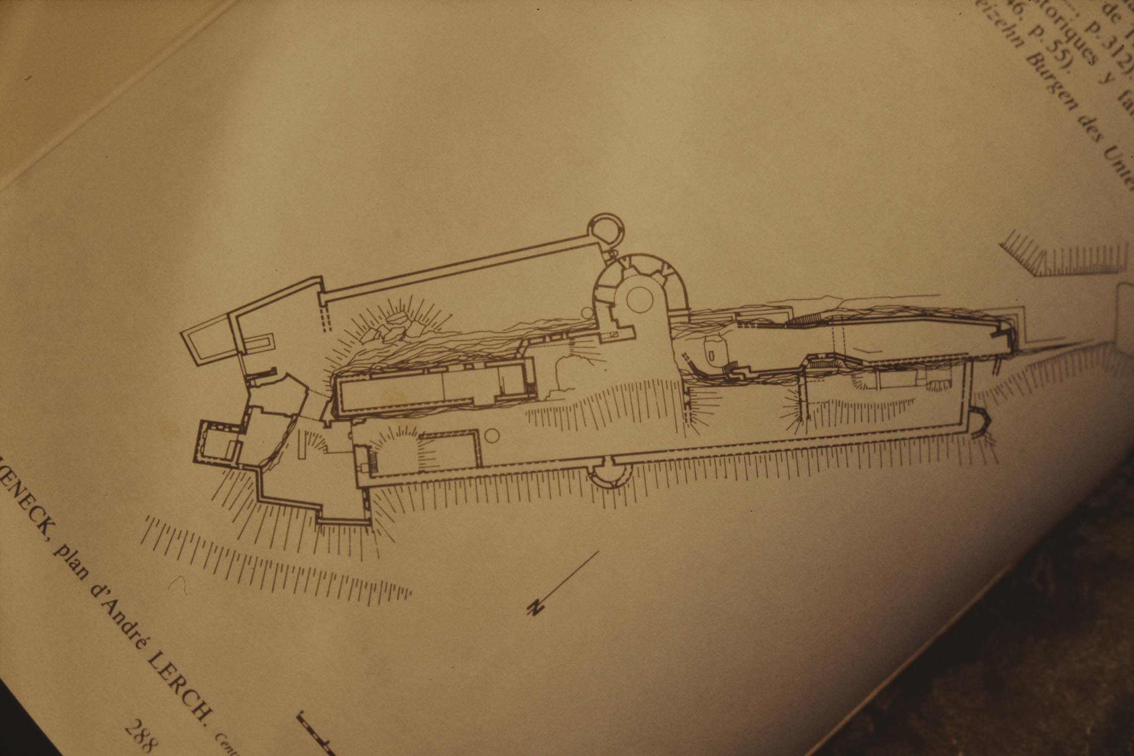 Château fort datant probablement du 13e siècle, reconstruit en 1286 et détruit en 1680 sur ordre du roi ; Scan manquant