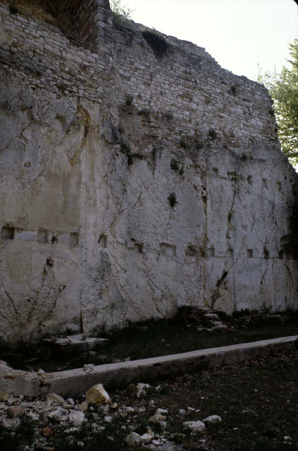 Vestiges du logis : mur avec trous de boulins, vue à distance