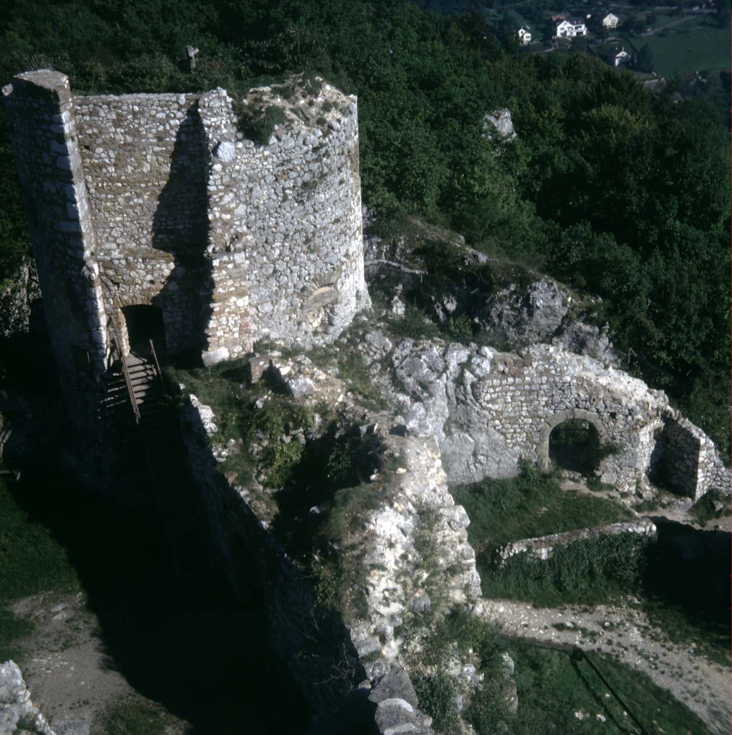 Vestiges de la tour d'artillerie et de la 2e porte, vus à distance depuis le niveau supérieur
