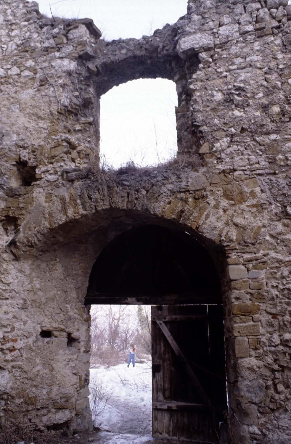 Vestiges de la tour d'accès du haut-château : porte et fenêtre, vue de l'intérieur