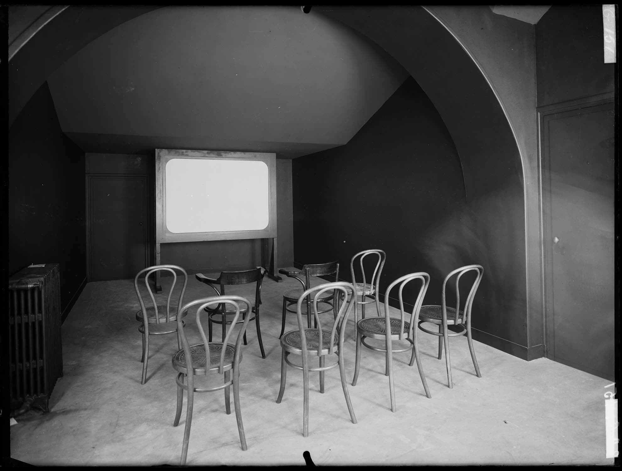 POP | Plateforme ouverte du patrimoineSalle de projection : petit écran de projection, chaises en bois