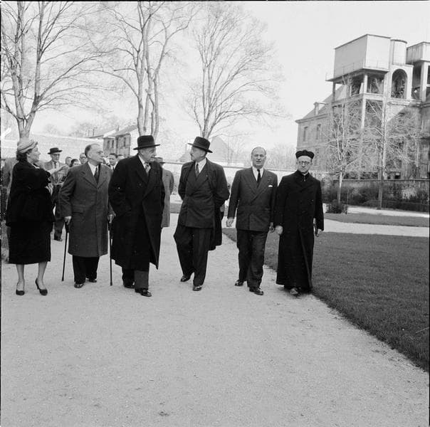Visite officielle de la basilique par Jean Berthoin, ministre de l'Education nationale : le ministre (au centre, à droite), le député de la Seine Gaston Palewski (à droite) et les invités aux abords de la basilique