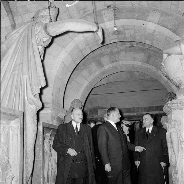 POP | Plateforme ouverte du patrimoineVisite officielle de la basilique par Jean Berthoin, ministre de l'Education nationale : le ministre (à gauche), le député de la Seine Gaston Palewski (au centre) et les invités dans la crypte