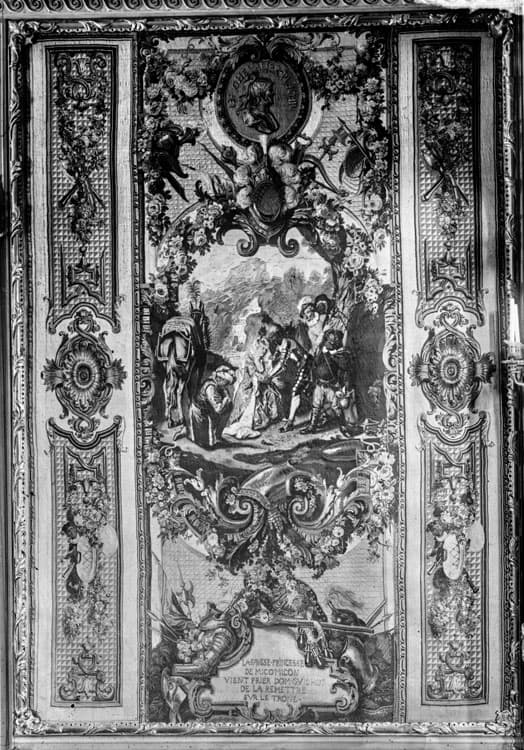 Tapisserie des Gobelins, tenture de l'histoire de Don Quichotte, pièce n°6 : scène avec le premier alentour, la fausse princesse de Miconicon vient prier Don Quichotte