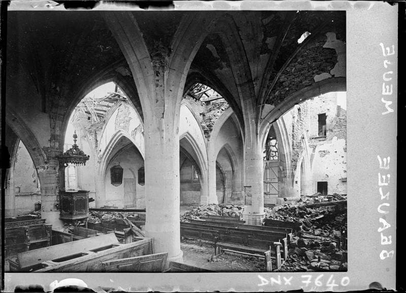 POP | Plateforme ouverte du patrimoineIntérieur : bas-côté et nef endommagés par les bombardements