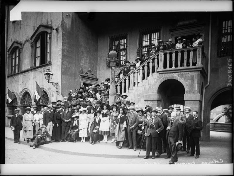 POP | Plateforme ouverte du patrimoineCongrès de 1920, portrait collectif : congressistes et femmes en costume traditionnel alsacien devant la façade