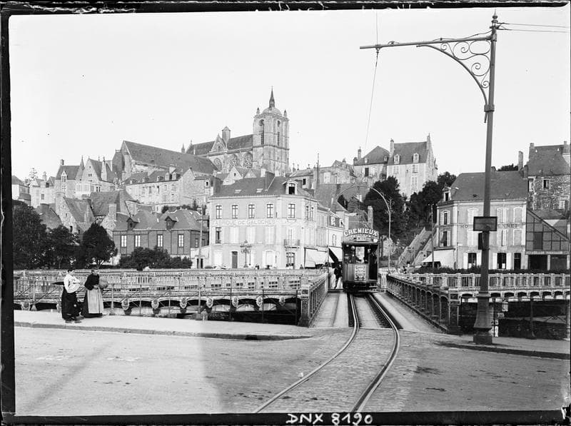 Pont en X sur la Sarthe, tramway, tour et partie supérieure de la façade ouest de la cathédrale à l'arrière-plan