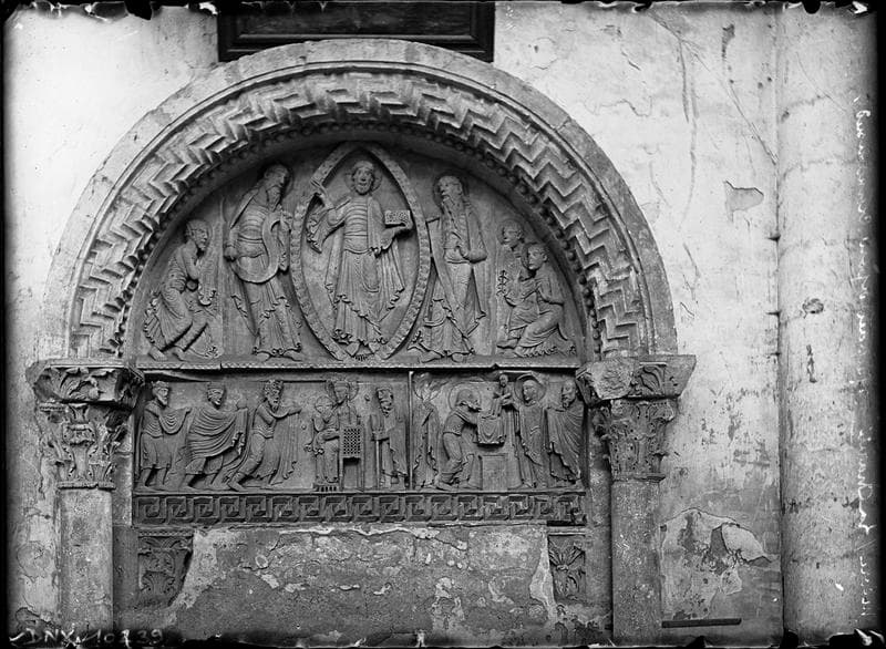 POP | Plateforme ouverte du patrimoineClocher nord : tympan et linteau de la face ouest déposé dans le croisillon sud