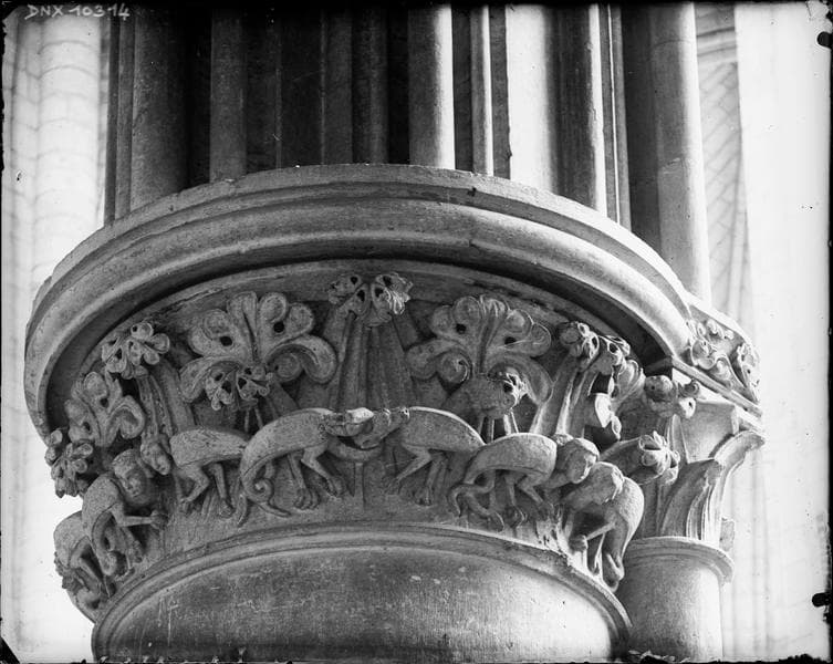 POP | Plateforme ouverte du patrimoineIntérieur : chapiteau du bas-côté nord sculpté de feuillages et d'animaux fantastiques à tête humaine