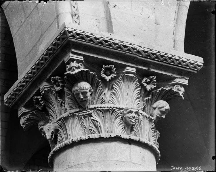 POP | Plateforme ouverte du patrimoineIntérieur : chapiteau de la nef sculpté de feuillages, de têtes humaines et d'une tête animale