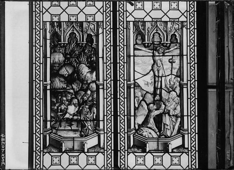 POP | Plateforme ouverte du patrimoineVitrail, scènes de la Passion : Le Christ en Croix transpercé d'une lance et la Descente aux limbes