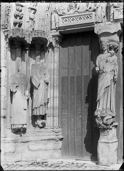 POP | Plateforme ouverte du patrimoineFaçade ouest, portail principal, côté gauche : Vierge à l'Enfant au trumeau et piédroit orné de deux statues acéphales