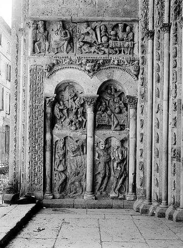 ABBATIALE ; PORCHE ; GAUCHE ; BAS RELIEF ; ARCADE ; FRISE ; SCULPTURE ; ART ROMAN