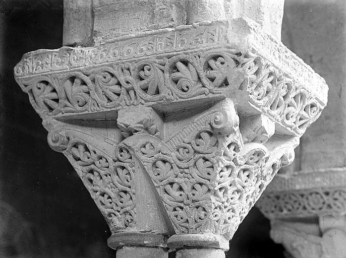 ABBAYE ; CLOITRE ; DETAIL ; CHAPITEAU ; TAILLOIR ; SCULPTURE ; FEUILLAGE ; ART ROMAN