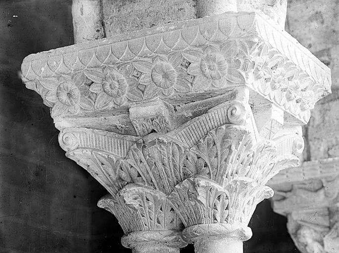 ABBAYE ; CLOITRE ; DETAIL ; CHAPITEAU ; TAILLOIR ; FEUILLAGE ; FLEUR ; SCULPTURE ; ART ROMAN