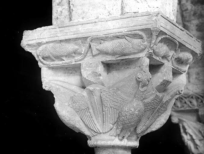 ABBAYE ; CLOITRE ; DETAIL ; CHAPITEAU ; TAILLOIR ; OISEAU ; POISSON ; SCULPTURE ; ART ROMAN