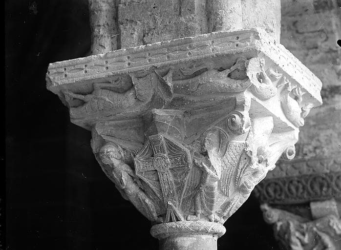 ABBAYE ; CLOITRE ; DETAIL ; CHAPITEAU ; TAILLOIR ; CROIX ; ANGE ; SCULPTURE ; ART ROMAN
