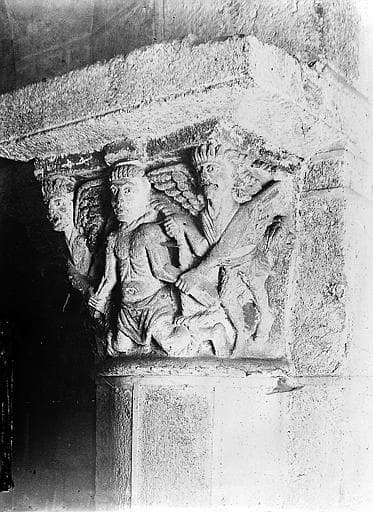 Chapiteau sculpté: deux anges encadrant et retenant un homme