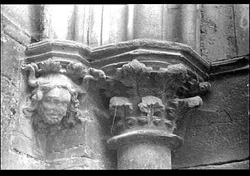 INTERIEUR ; CHAPITEAU ; GROUPE ; HAUT-RELIEF ; ORNEMENT VEGETAL ; HISTORIE ; ETRE FANTASTIQUE ; TETE ; CORNE ; ART GOTHIQUE